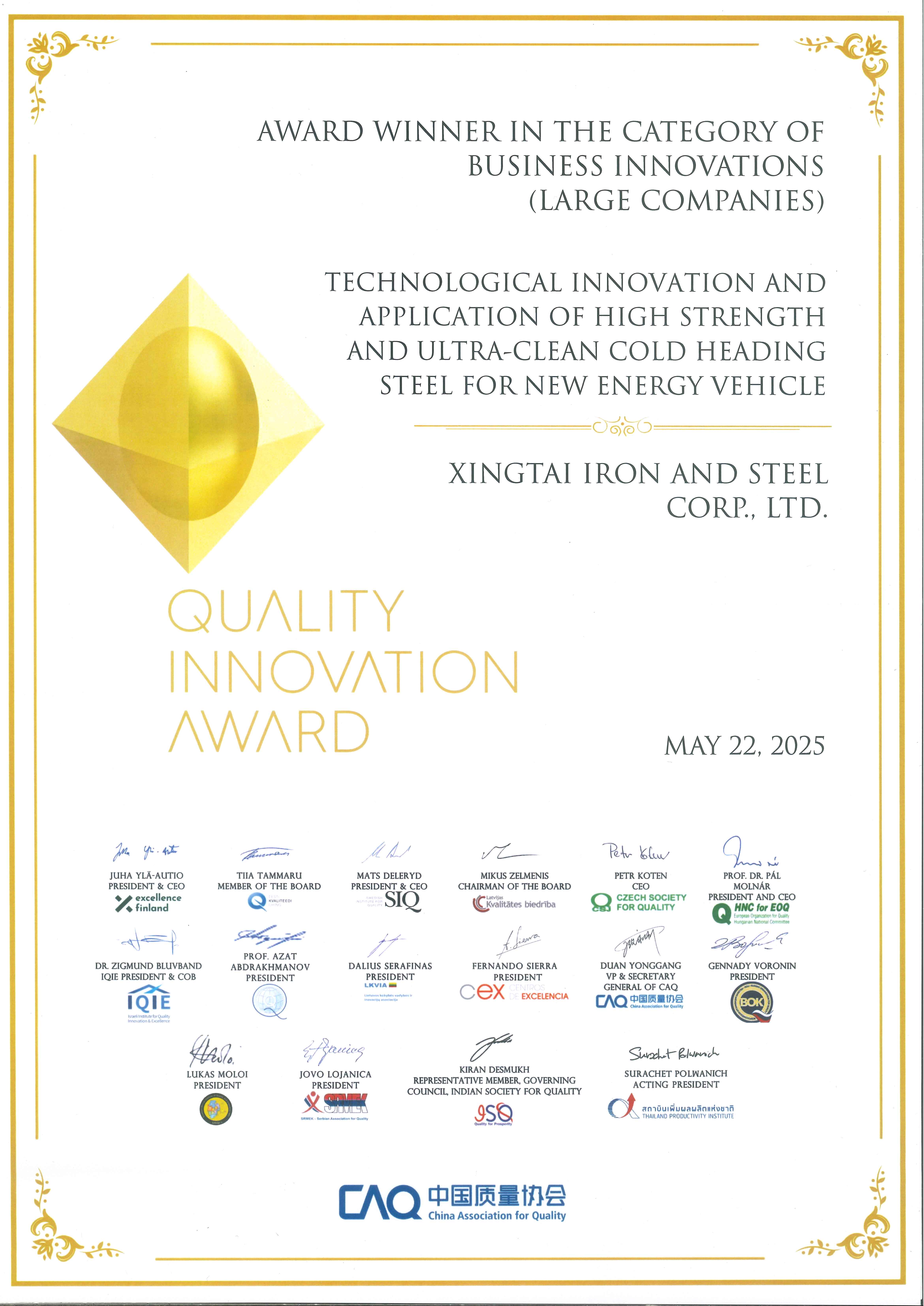 Xingtai Iron and Steel Co., Ltd. participated in the press conference and award ceremony of the 2024 International Quality Innovation Competition held in Thailand. The project "Technological Innovation and Application of High-strength Ultra-high Cleanliness Cold Upsetting Steel for New Energy Vehicles" released by Xingtai Iron and Steel won the first prize of the competition. This is the first international award won by Xinggang in history, and it is also the first international award in the field of steel since the International Quality Innovation Competition was held.