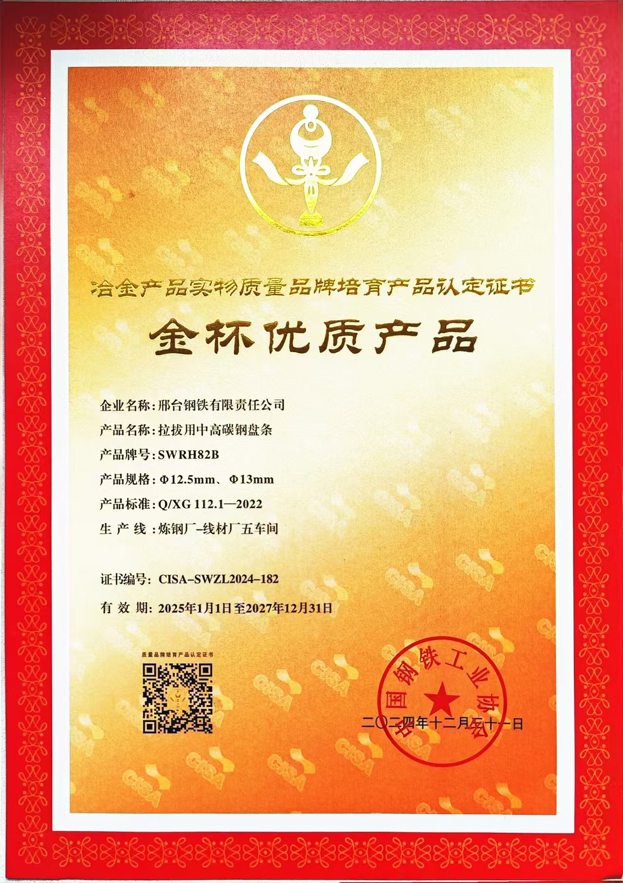 In 2024, the company's high-quality plate strips XG10B21 products containing boron cold uperting and cold extrusion won the certification certificate of physical quality brand cultivation products (gold cup high-quality products) of metallurgical products, referred to as the Golden Cup Award. The selection activity of "Physical Quality Brand Cultivation of Metallurgical Products" was launched in March 24 and sponsored by the China Iron and Steel Industry Association. The Gold Cup Award is the only relatively authoritative award in the metallurgical industry organized by the China Iron and Steel Industry Association.