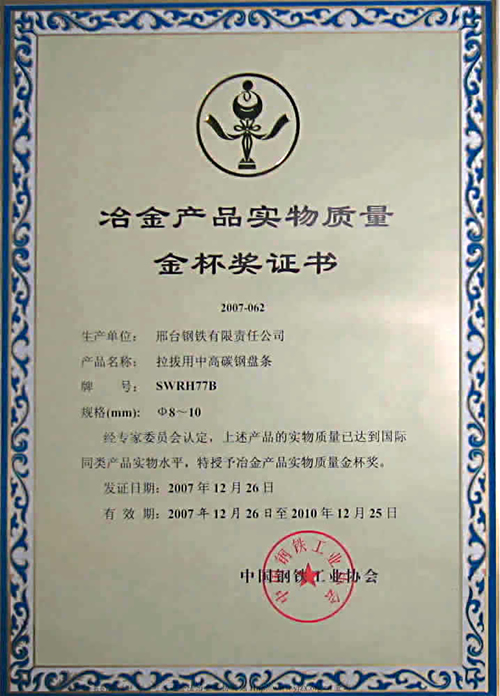 拉撥用中高碳鋼盤條SWRH77B獲冶金產(chǎn)品實(shí)物質(zhì)量金杯獎