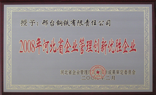 - 邢鋼榮獲“2008年河北省企業(yè)管理創(chuàng)新優(yōu)勝企業(yè)”榮譽(yù)稱號(hào)