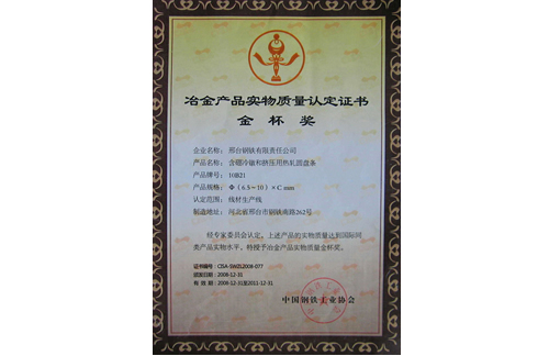 2008年12月31日,邢鋼含硼冷鐓和冷擠壓用鋼盤條10B21獲冶金產(chǎn)品實物質量金杯獎。