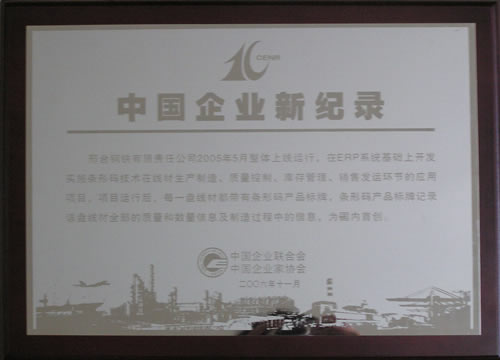 2006年11月,邢臺(tái)鋼鐵有限責(zé)任公司2005年整體上線(xiàn)運(yùn)行,在ERP系統(tǒng)基礎(chǔ)上開(kāi)發(fā)實(shí)施條行碼技術(shù)在線(xiàn)材生產(chǎn)制造、質(zhì)量控制、庫(kù)存管理、銷(xiāo)售發(fā)運(yùn)環(huán)節(jié)的應(yīng)用項(xiàng)目,項(xiàng)目運(yùn)行后每一條線(xiàn)材都帶有條型碼產(chǎn)品標(biāo)牌,條型碼產(chǎn)品標(biāo)牌記錄該盤(pán)線(xiàn)材全部的質(zhì)量和數(shù)量信息及制造過(guò)程中的信息,為國(guó)內(nèi)首創(chuàng)。