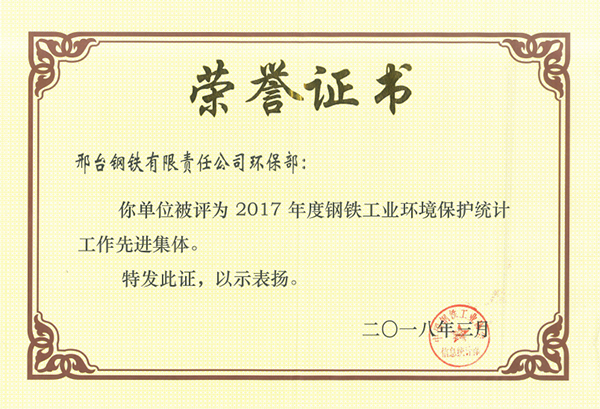 邢鋼被評為2017年度鋼鐵工業(yè)環(huán)境保護(hù)統(tǒng)計(jì)工作先進(jìn)集體