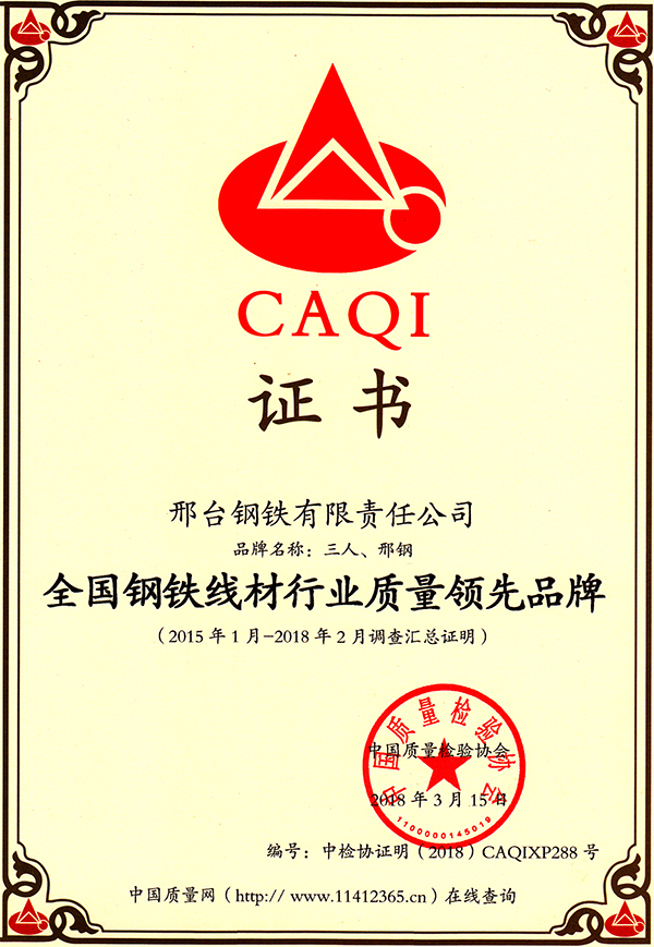 2018年3月15日,邢鋼“三人、邢鋼”品牌獲得“全國鋼鐵線材行業(yè)質(zhì)量領(lǐng)先品牌”稱號。