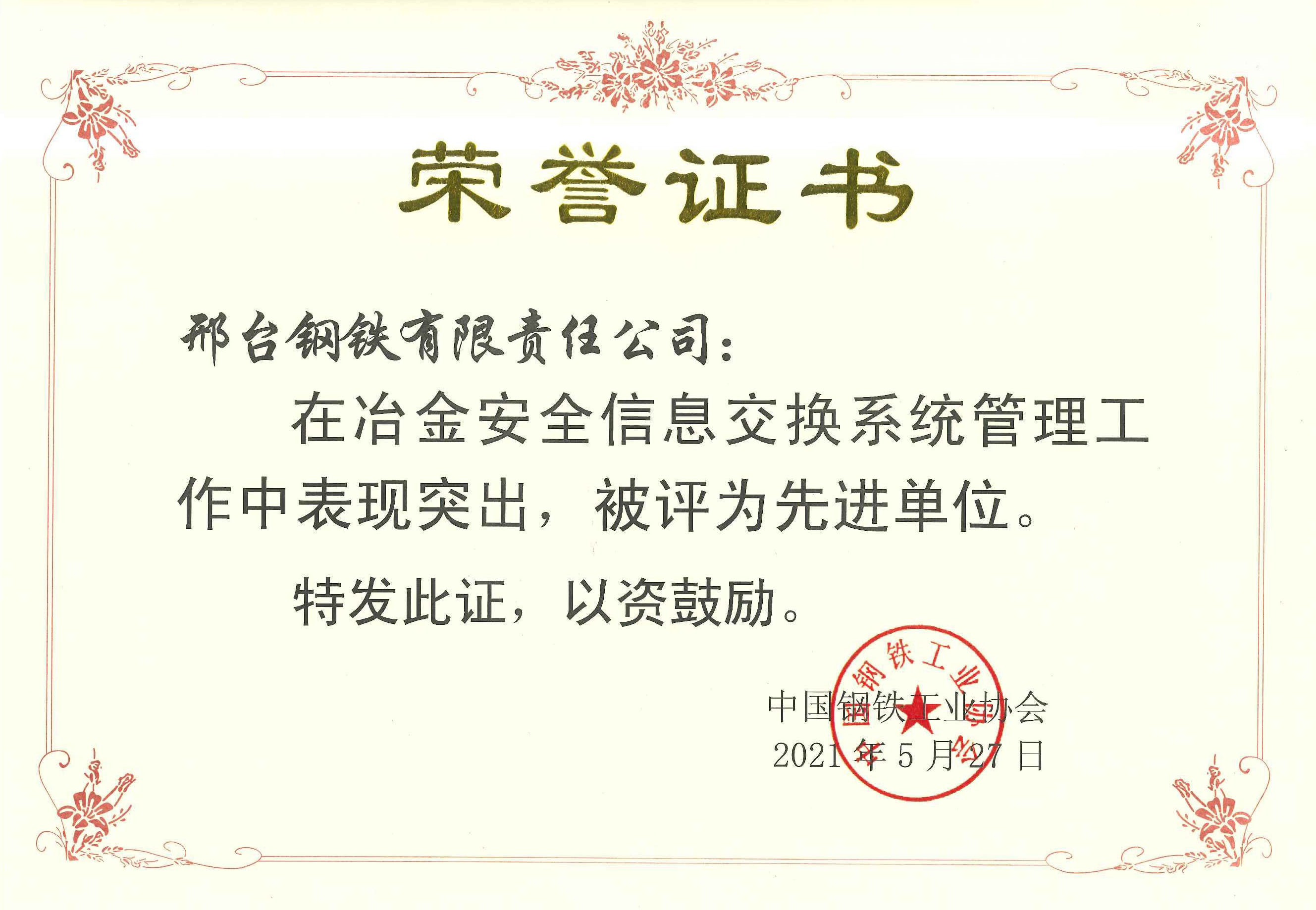 邢鋼被評為“冶金安全信息交換系統(tǒng)管理工作先進單位”