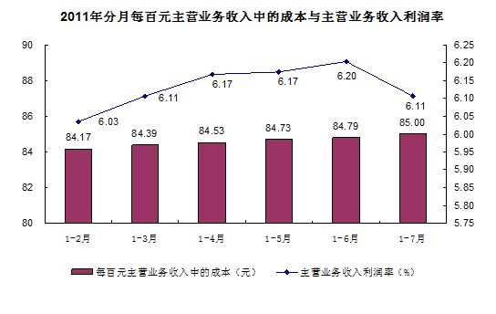 規(guī)模以上工業(yè)企業(yè)實(shí)現(xiàn)主營業(yè)務(wù)收入458544億元,同比增長29.8%。每百元主營業(yè)務(wù)收入中的成本為85.00元,主營業(yè)務(wù)收入利潤率為6.11%。