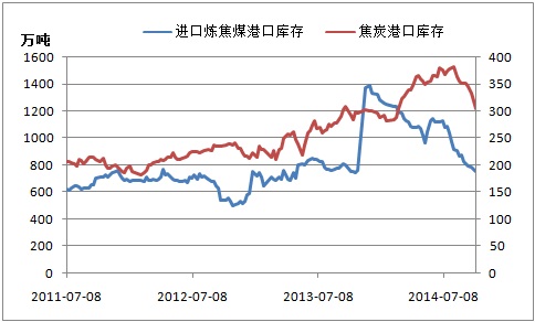 據(jù)我的鋼鐵網(wǎng)監(jiān)測,截至10月10日日照港、連云港、天津港焦炭庫存合計(jì)303.7萬噸,自8月8日達(dá)到380.6萬噸的年內(nèi)最高位之后,港口庫存處于持續(xù)下滑態(tài)勢。不過,國內(nèi)鋼企焦炭庫存仍保持低位,并無明顯補(bǔ)庫意愿,導(dǎo)致焦炭價(jià)格暫穩(wěn)運(yùn)行,一旦后期鋼價(jià)持續(xù)堅(jiān)挺,或推動(dòng)鋼企入市采購。
