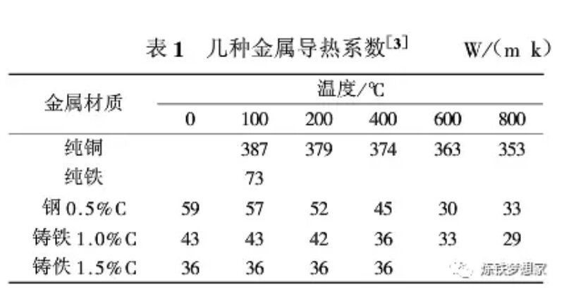 2000年以來銅冷卻壁以其良好的導(dǎo)熱能力和形成渣皮能力在我國高爐上得到廣泛的使用,目前全國約200座以上的高爐采用銅冷卻壁,尤其是在爐腹、爐腰和爐身下部等熱負(fù)荷較高的區(qū)域。高爐冷卻壁主要包括鑄鐵和純銅,另外還出現(xiàn)過鑄鋼冷卻壁。鑄鐵冷卻壁抗熱震性能差、導(dǎo)熱系數(shù)低。另外,其冷卻水管是鑄入鑄鐵本體內(nèi)的,由于材質(zhì)和膨脹系數(shù)的不同,形成氣隙層,而影響了傳熱。這些缺陷限制了鑄鐵冷卻壁的進(jìn)一步發(fā)展。因此,從上世紀(jì)70年代歐洲開發(fā)和使用了銅冷卻壁,得到較好的效果。表1為幾種不同金屬導(dǎo)熱系數(shù),可以看出純銅的導(dǎo)熱系數(shù)遠(yuǎn)優(yōu)于其他材料。