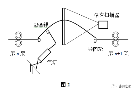 活套是用來檢測(cè)和調(diào)節(jié)相鄰機(jī)架間速度關(guān)系從而實(shí)現(xiàn)無張力軋制的設(shè)備?;钐字饕苫钐讙呙杵?、起套輥及其調(diào)節(jié)器等組成,結(jié)構(gòu)如(圖2)所示。主要作用是根據(jù)檢測(cè)的套位信號(hào)來控制上游軋機(jī)的速度,實(shí)現(xiàn)自動(dòng)控制系統(tǒng)。