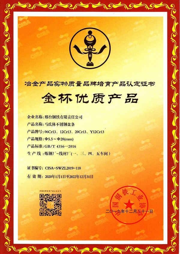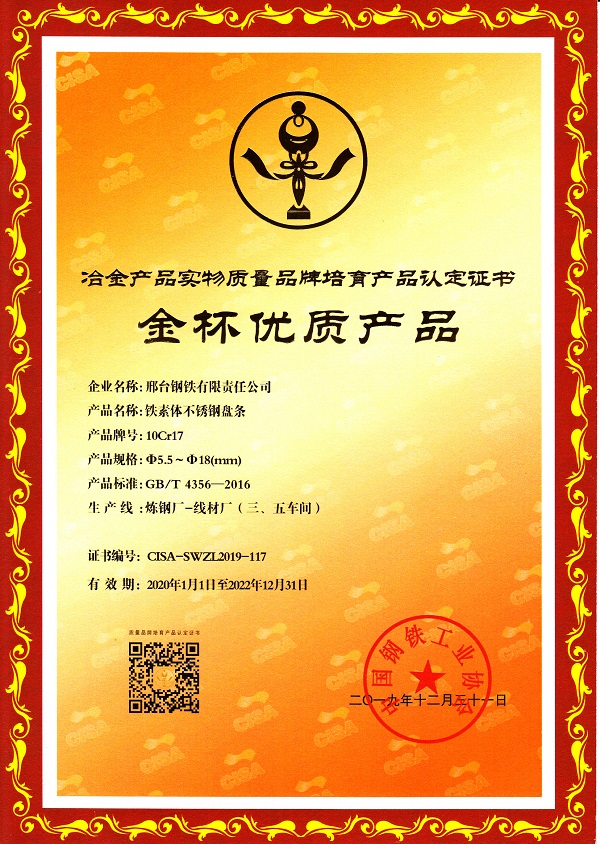 The wire for copper weld wire rod, martensitic stainless-steel wire rod and ferrite stainless steel wire rodobtain the quality certificate of Gold Cup Quality Products for Metallurgical Products