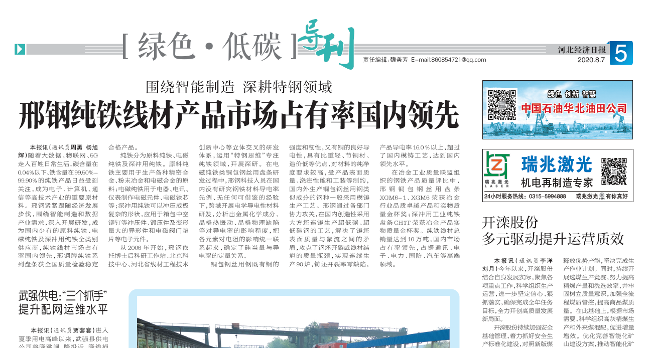 本報(bào)訊(通訊員周勇 楊旭輝)隨著大數(shù)據(jù)、物聯(lián)網(wǎng)、5G走入日常生活,碳含量在0.04%以下、鐵含量在99.50%-99.90%的純鐵產(chǎn)品日益受到關(guān)注,成為電子、計(jì)算機(jī)、通信等高技術(shù)產(chǎn)業(yè)的重要原材料。邢鋼緊緊跟隨我國經(jīng)濟(jì)發(fā)展步伐,圍繞智能制造和數(shù)據(jù)產(chǎn)業(yè)需求,深入開展研發(fā),成為國內(nèi)少有的原料純鐵、電磁純鐵及深沖用純鐵全類別供應(yīng)商,純鐵線材市場(chǎng)占有率國內(nèi)領(lǐng)先,邢鋼牌純鐵系列盤條獲全國質(zhì)量檢驗(yàn)穩(wěn)定合格產(chǎn)品。