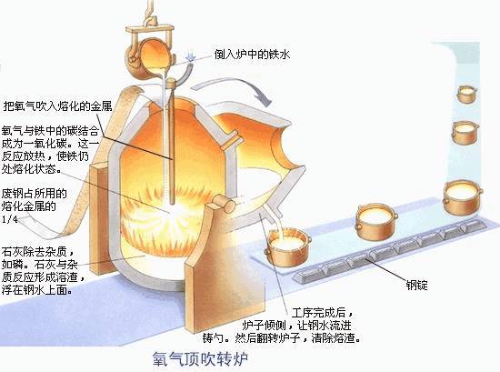 生鐵中的各種雜質,在高溫下,在不同程度上都與氧有較大的親和力。因此可以利用氧化的方法使它們成為液體、固體或氣體氧化物,液體和固體氧化物在高溫下與爐襯和加入爐內的熔劑起作用,結合成爐渣,并在扒渣時被排除爐外,氣體也在鋼水沸騰時被CO帶到爐外。