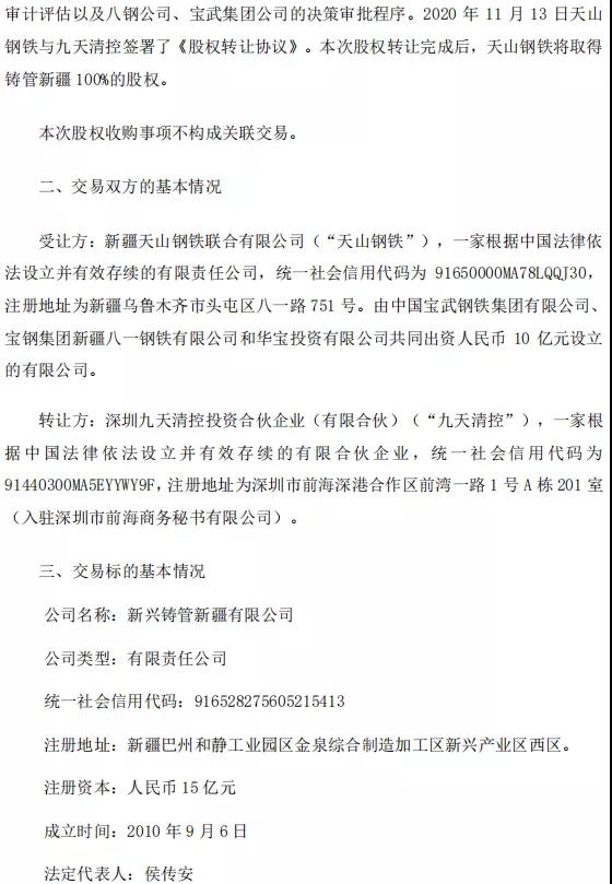 11月13日晚間,八一鋼鐵發(fā)布公告稱,該公司控股股東寶鋼集團(tuán)新疆八一鋼鐵有限公司的控股子公司新疆天山鋼鐵聯(lián)合有限公司擬受讓深圳九天清控投資合伙企業(yè)持有的新興鑄管新疆有限公司100%股權(quán)。11月13日,天山鋼鐵與九天清控簽署了《股權(quán)轉(zhuǎn)讓協(xié)議》。本次股權(quán)轉(zhuǎn)讓以2019年12月31日為基準(zhǔn)日,以公司經(jīng)天健會計師事務(wù)所審計、北京中企華資產(chǎn)評估有限責(zé)任公司評估后的100%股權(quán)價值為基礎(chǔ),各方協(xié)商確定本次股權(quán)轉(zhuǎn)讓價款為21.81億元。