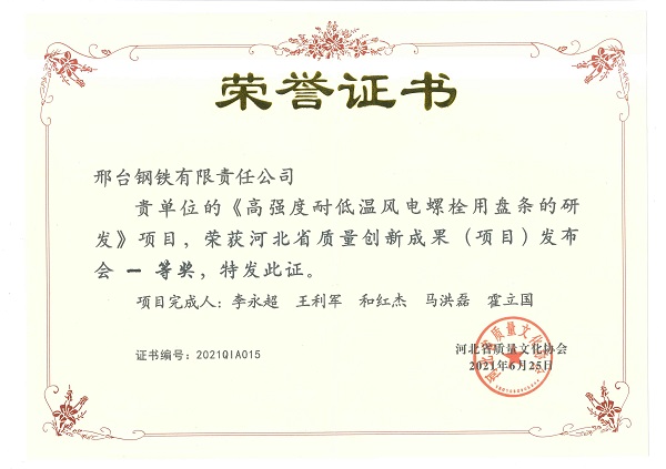 近日,由河北省質(zhì)量文化協(xié)會主辦的“河北省第四屆質(zhì)量創(chuàng)新成果(項目)發(fā)布會”在秦皇島召開,邢鋼精益六西格瑪代表團(tuán)3個成果入圍發(fā)布會名單,其中《高強度耐低溫風(fēng)電螺栓用盤條的研發(fā)》和《提高不銹鋼1Cr13澆次連澆爐數(shù)》榮獲一等獎,《提高Q55SiCrA-1線材成材率》榮獲二等獎。