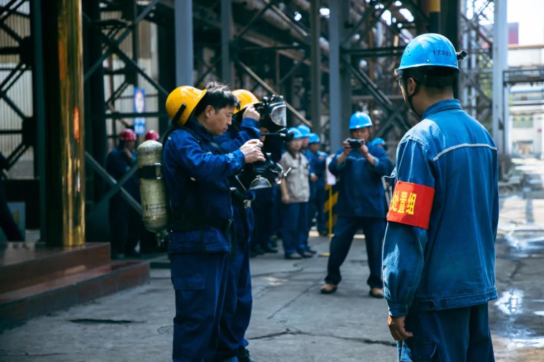 隨后,參會人員一起現(xiàn)場觀摩了邢鋼高溫熔融金屬爆噴事故現(xiàn)場應急處置演練。本次演練,模擬煉鋼廠加料跨天車向2#轉(zhuǎn)爐加廢鋼時發(fā)生爆噴為背景,演示了事故上報、安全疏散、預案啟動、現(xiàn)場搶險、應急救援等環(huán)節(jié)。