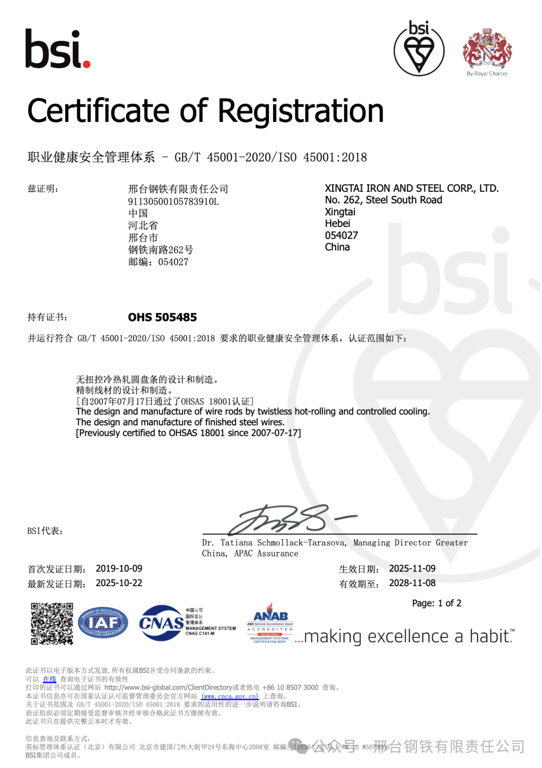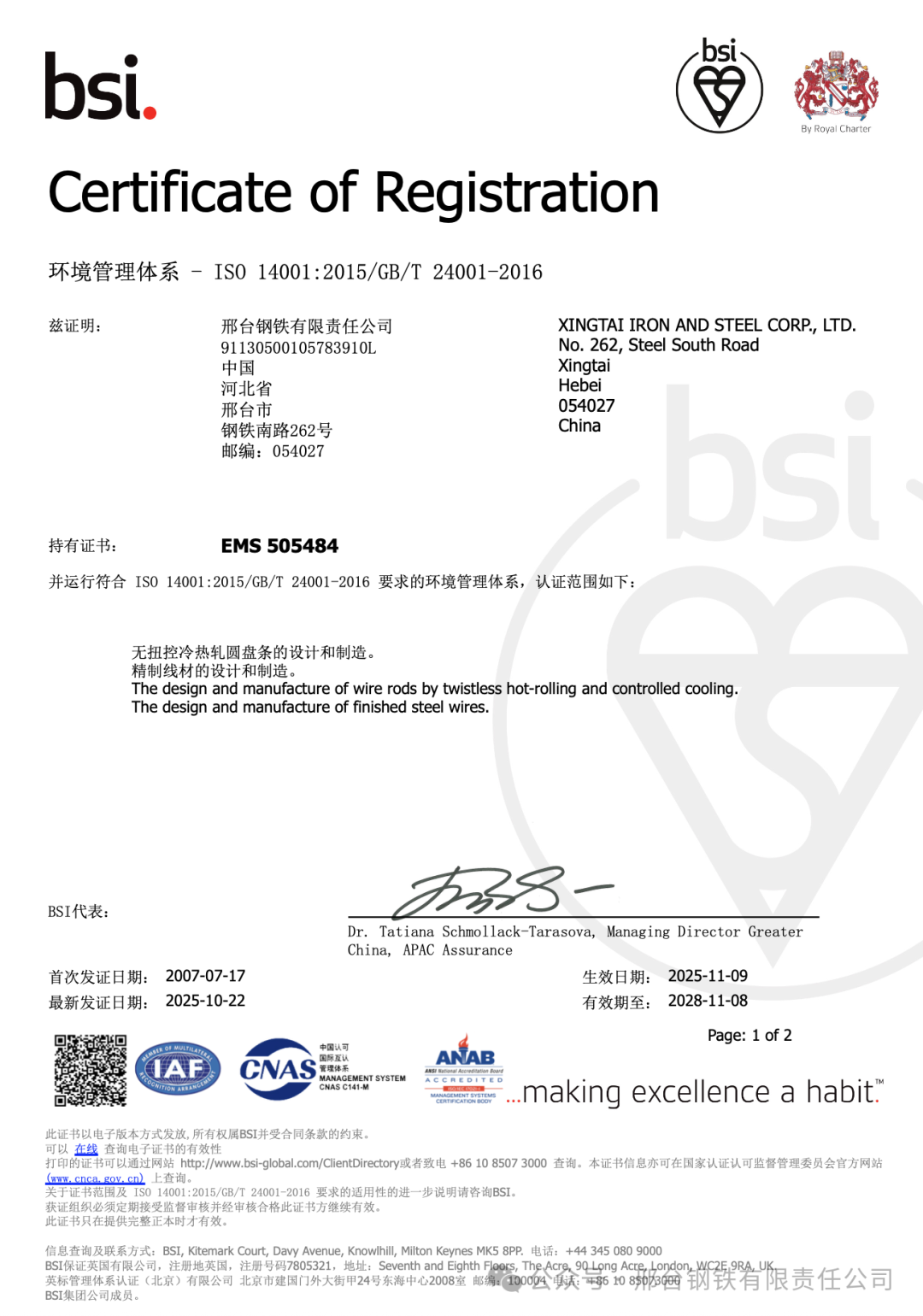 近日,邢臺鋼鐵有限責(zé)任公司(簡稱“邢鋼”)順利通過英國標(biāo)準(zhǔn)協(xié)會(huì)(BSI)對其職業(yè)健康安全管理體系與環(huán)境管理體系的再認(rèn)證審核,取得新版證書。該公司自2007年首次通過該體系認(rèn)證以來,已連續(xù)十八年保持體系持續(xù)有效運(yùn)行,體現(xiàn)出在安全與環(huán)境管理方面長期穩(wěn)定的合規(guī)能力和管理韌性。